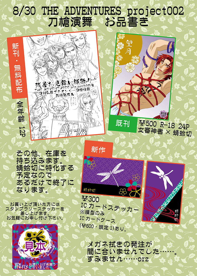8/30プチオンリーのスペース確定しました。 「紫紺20」です。 一番端っこなので気楽です。 まあ、女審神者×男士って他にいないですもんねーw 今30日に無料配布する漫画をちまちま描いています。 本文8ページの予定です。 グッズは蜻蛉切に特化する方向で考えているので、新作はないですが、 無配漫画頑張って描いてますので、是非お立ち寄りください~。 [0回]